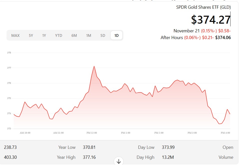 - صندوق GLD (أكبر ETF مدعوم بالذهب) أغلق قرب 374 دولارًا للوحدة نهاية الأسبوع، وهو قريب من قمّته التاريخية، مع أصول تحت الإدارة تتجاوز 130 مليار دولار تقريبًا.