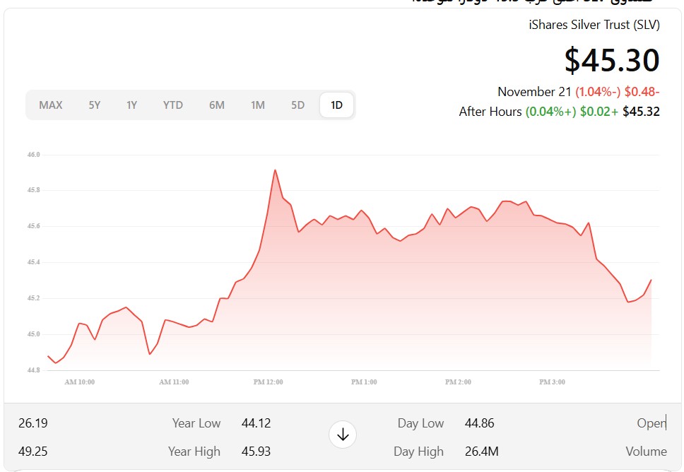 - صندوق SLV أغلق قرب 45.3 دولارًا للوحدة.